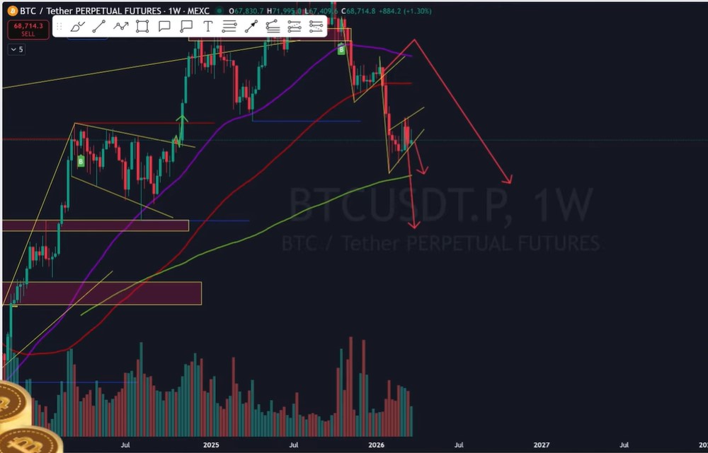- Khả năng cao giá sẽ giảm về vùng SMA 200 tuần quanh 59,000–60,000 USD (khoảng 59,600 USD)