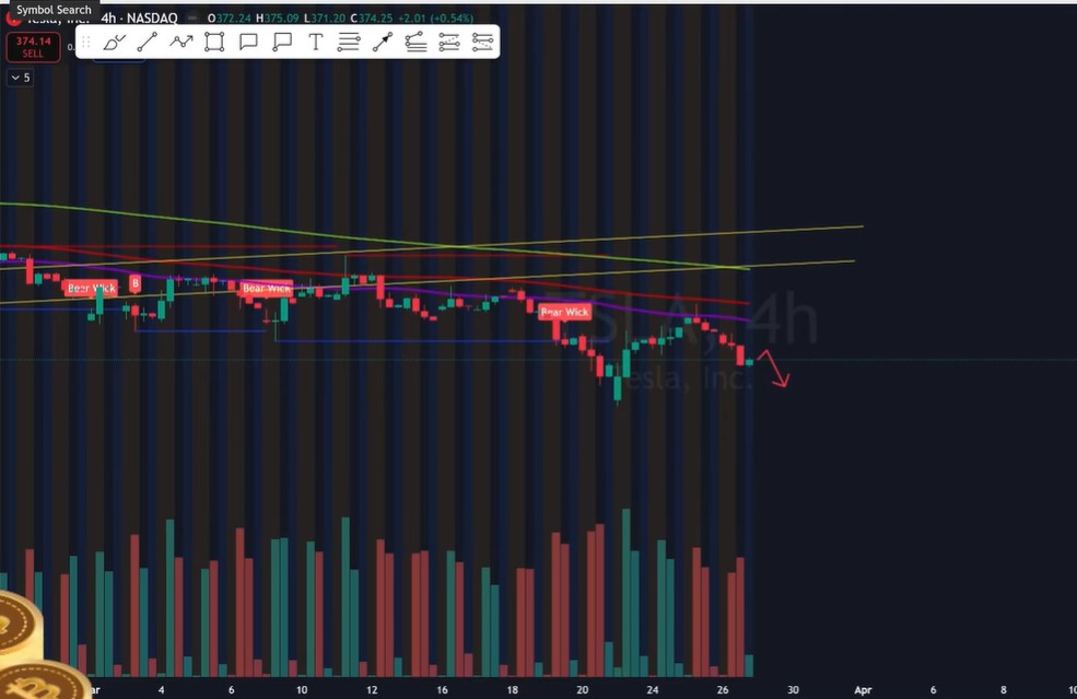 - TSLA đang đi rất sát với kịch bản trước đó (tăng lên ~402 USD rồi giảm về ~382 USD)